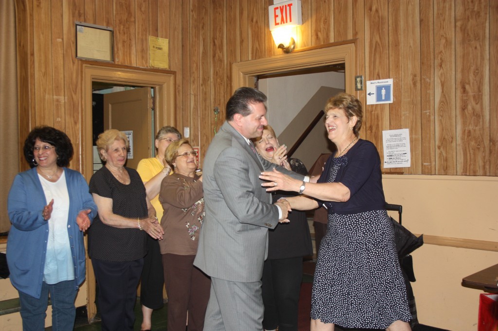 Senator Joe Addabbo congratulates Margaret Finnerty on her amazing tenure as president of Richmond Hill South Civic while her board cheers her on. Forum Newsgroup Photo by Patricia Adams.