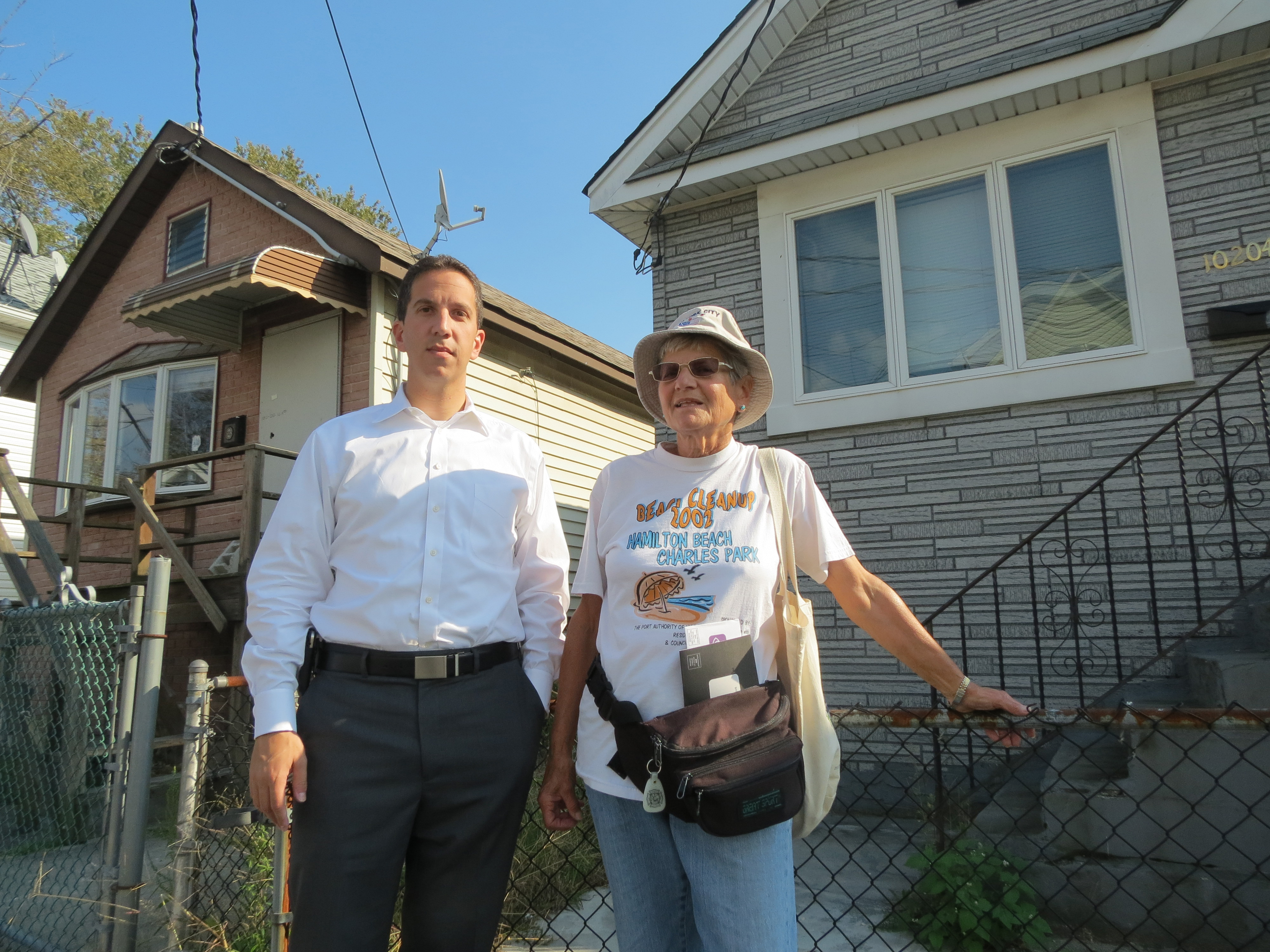 Assemblyman Phil Goldfeder and civic leader Marie Persans stand in front of two abandoned homes on 163rd Road in Hamilton Beach. Anna Gustafson/The Forum Newsgroup