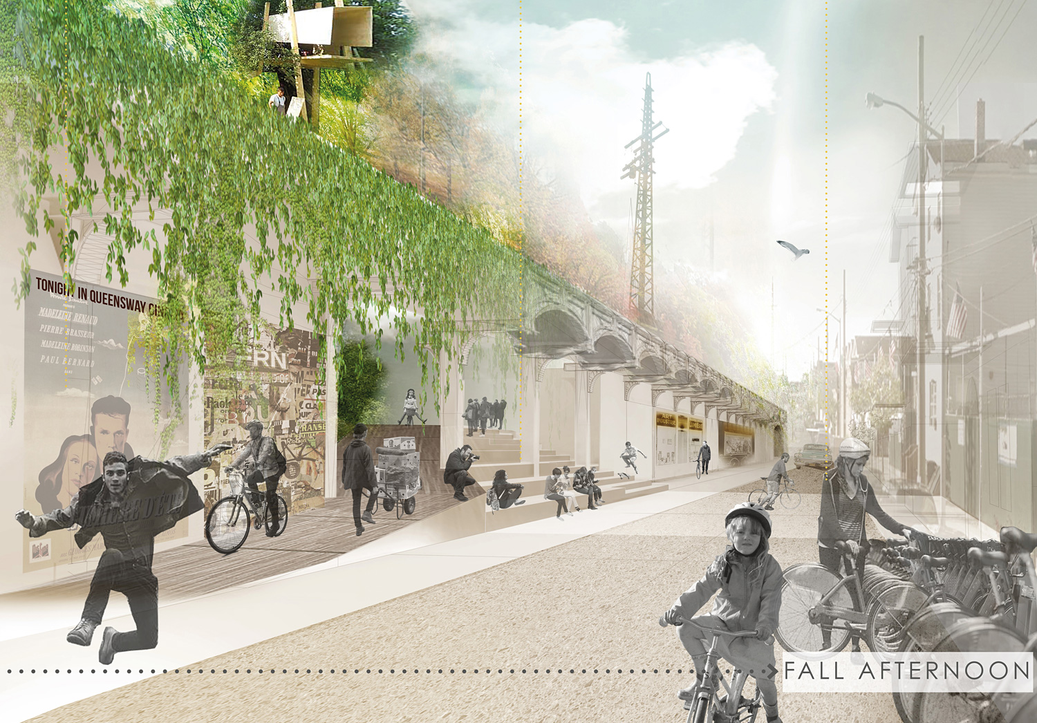 People from around the world submitted applications for possible ways to utilize 3.5 miles of abandoned railroad running from Rego Park to Ozone Park. This design, created by Carrie Wilbert, of Paris, landed first place.