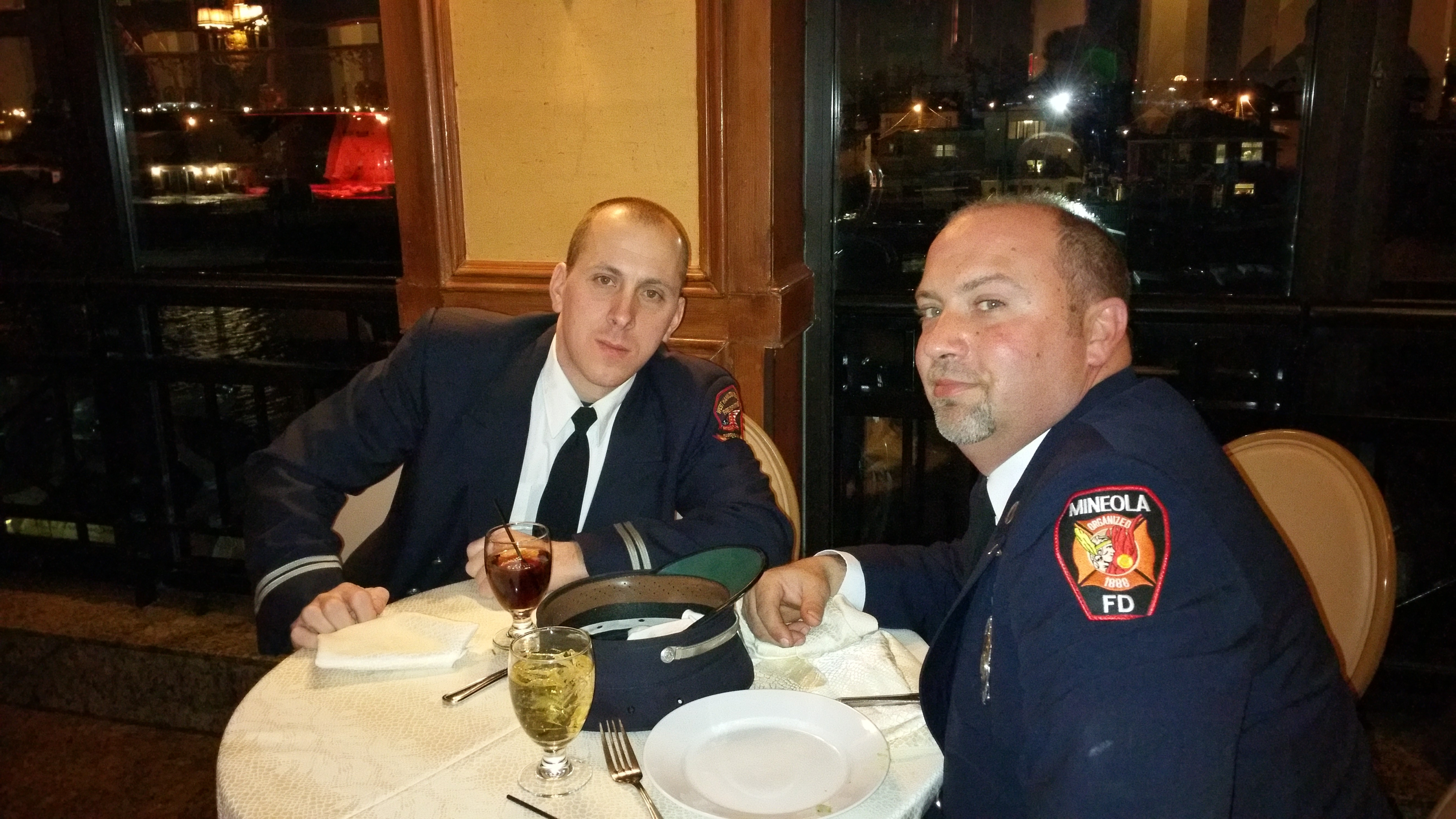 The West Hamilton Beach Volunteer Fire Department last Thursday celebrated 87 years of serving the community with its annual anniversary dinner at Russo’s on the Bay. Marking the milestone, along with guest speakers Queens Borough President Melinda Katz and city Comptroller Scott Stringer, were Honorary WHBVFD Commissioner Marge Centrone (l. to r.), Roseanne Delano, widow of former WHBVFD Chief and city Firefighter Kevin Delano, Kevin Delano, Jr., and Barbara Udowitch. Plenty of first responders turned out in Howard Beach to support the historic department, including WHBVFD Capt. Steven Pasqualicchio (l.) and Mineola FD First Lt. Michael Eich.