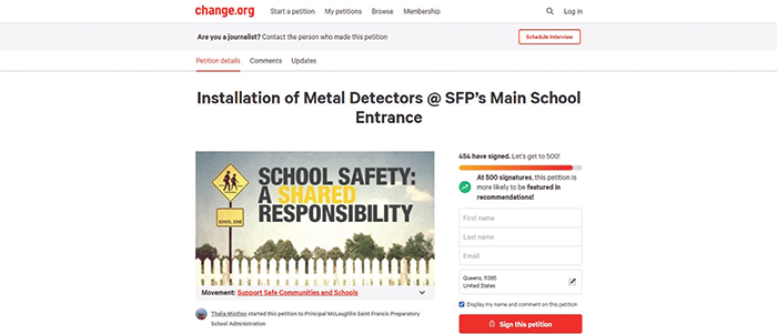 “In light of the recent social media threats, we, the parents of the SFP students, respectfully request that Metal Detectors be installed at the Main Entrance of the School and that all other entrances are locked and alarmed at all times. This is the only way to ensure that a gun, or other weapon, can’t be snuck into the school,” Thalia Misthos wrote in a petition on the crowdsourcing site change.org addressed to SFP Principal Pat McLaughlin.