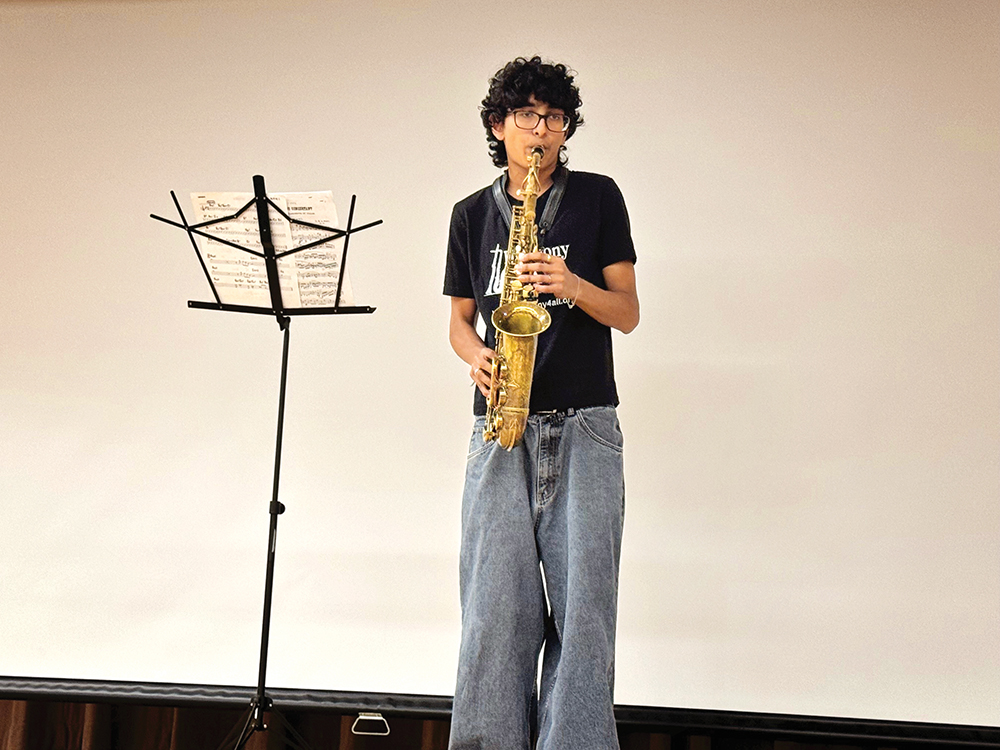Joshua Quddus demonstrates his talents on the saxophone.